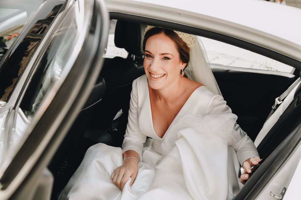 Carmen escogió un diseño de Jesús Peiró que adquirió en Isamar Atelier un diseño que encajaba 100% con la idea que tenía en mente, además fue un regalo de su madre. Para acompañar al vestido escogió con un espectacular velo de 4 metros de largo en seda con pequeñas perlas que iban distribuidas a lo largo de toda la tela de la firma Todo Velos.