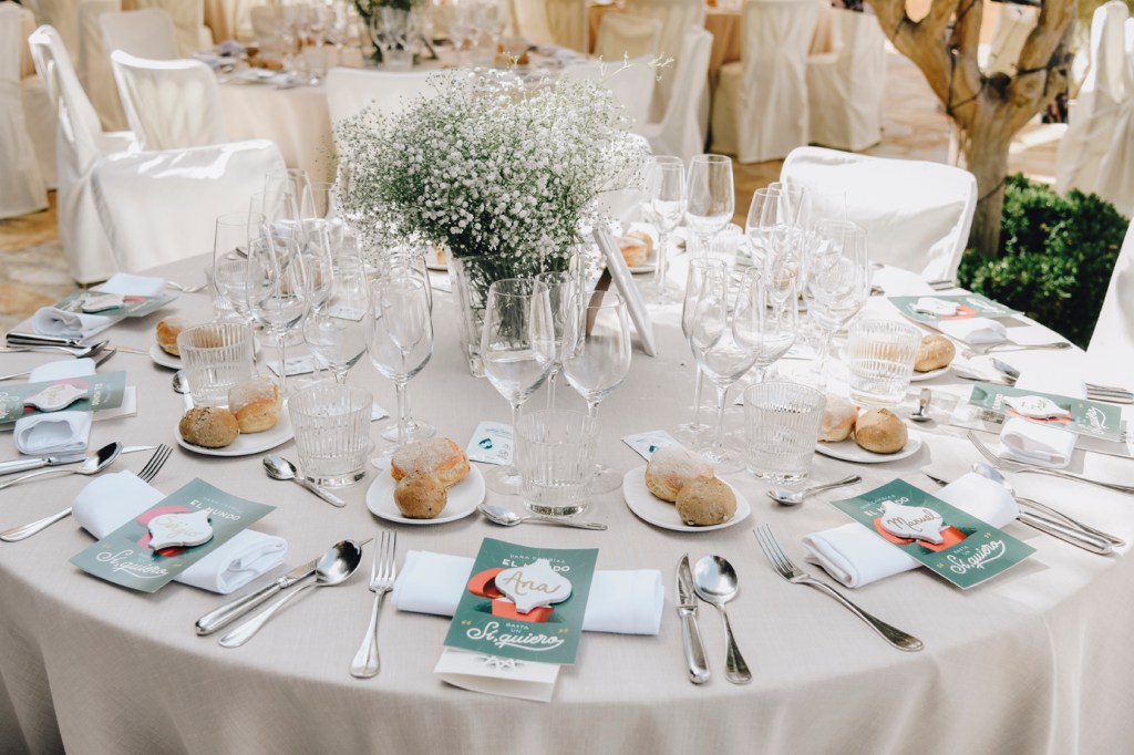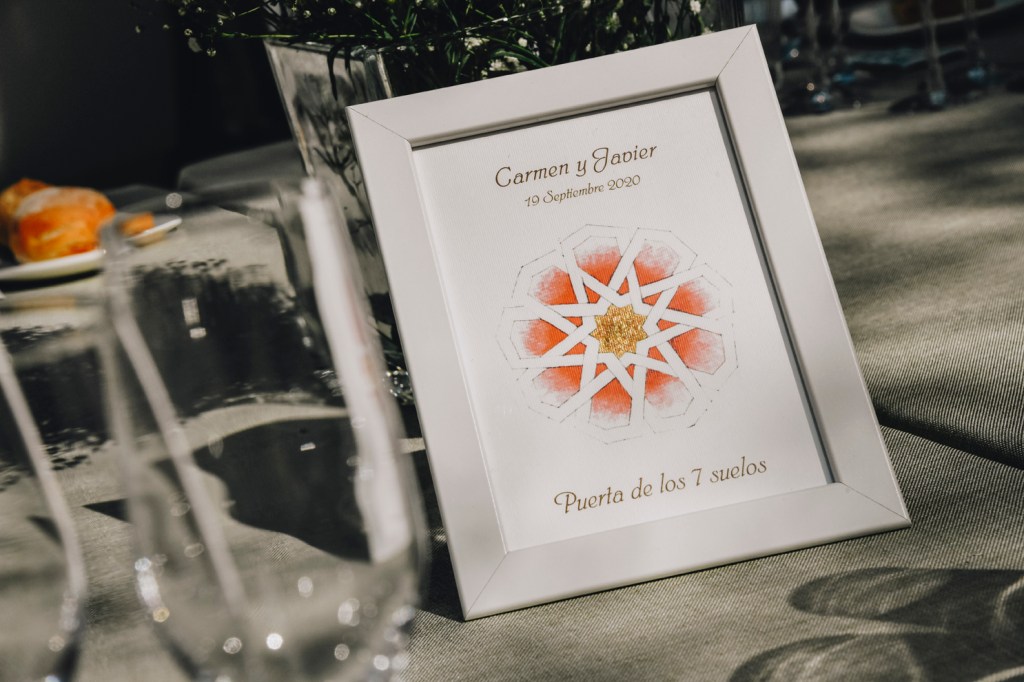 La temática de la boda giraba en torno a la Alhambra, como no podía ser de otra manera y en ella se inspiraron para diseñar las invitaciones, el sitting plan y los meseros. Los novios obsequiaron a sus invitados con el regalo azul de Unicef y unos marcasitios personalizados pintados a mano por la novia. La novia también se encargó de hacer a mano los meseros y las invitaciones.
