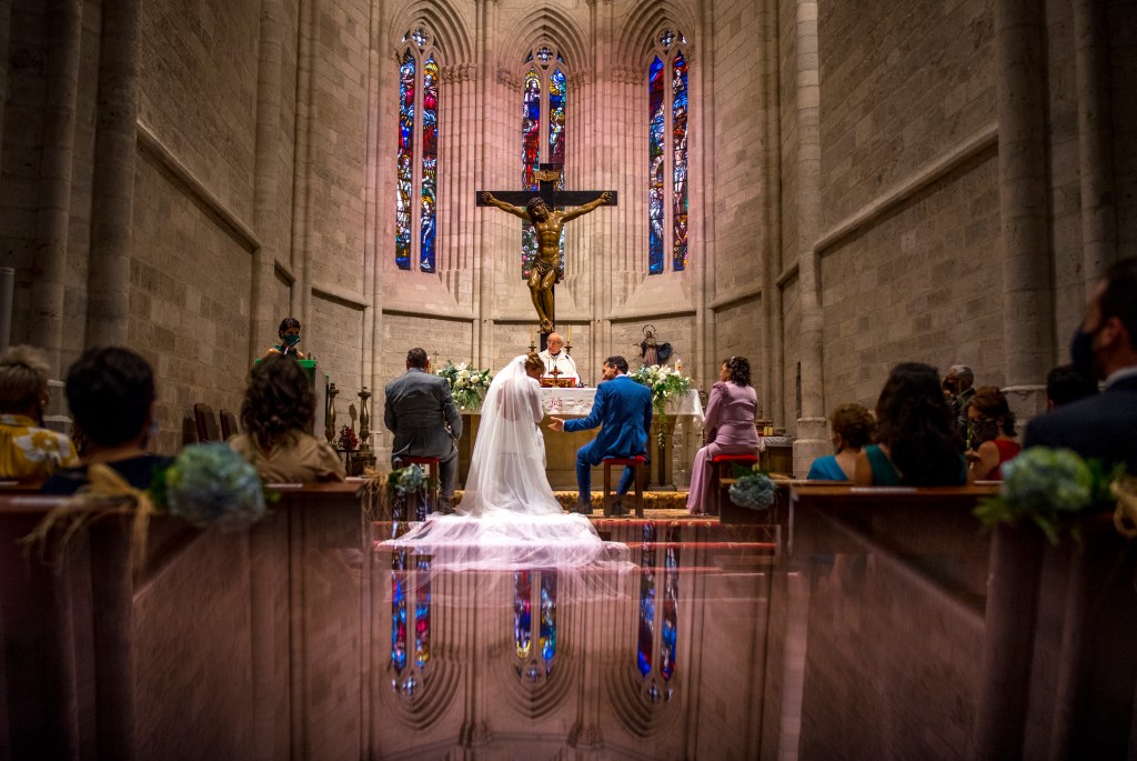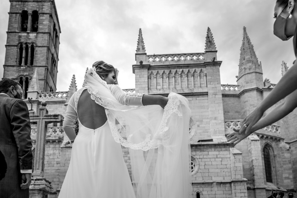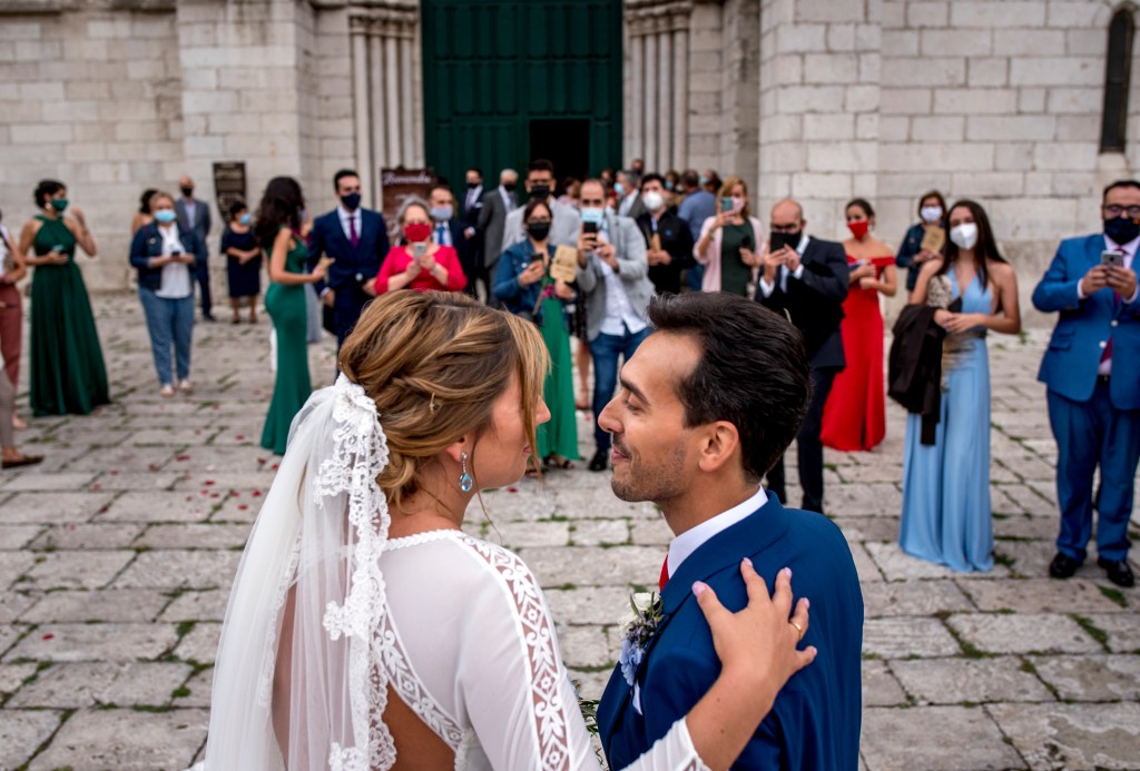 Para el reportaje fotográfico decidieron contar con Isma Sánchez. Era el proveedor que más claro tenían. Les encantaba su trabajo por las fotos artísticas que se salen de los clásicos posados, juegos de luces, sombras y líneas. Él y su equipo les hicieron sentir como en familia desde el primer momento algo que agradecen en momentos de tantos nervios. Además, gracias al cambio al plan C pudieron contar con el Museo Patio Herreriano como localización perfecta para su reportaje fotográfico.