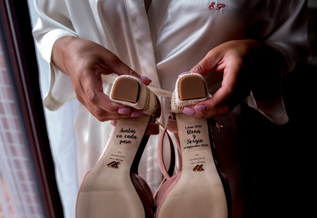 Para los zapatos escogió a la firma Just Ene, hechos a medida en terciopelo rosa. El rosa es su color favorito y no dudó al escoger sus zapatos. Los zapatos fueron un regalo de su prima y los personalizó con una pegatina en la suela que decía «Juntas en cada paso«. Un detalle súper especial.