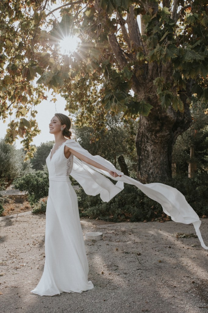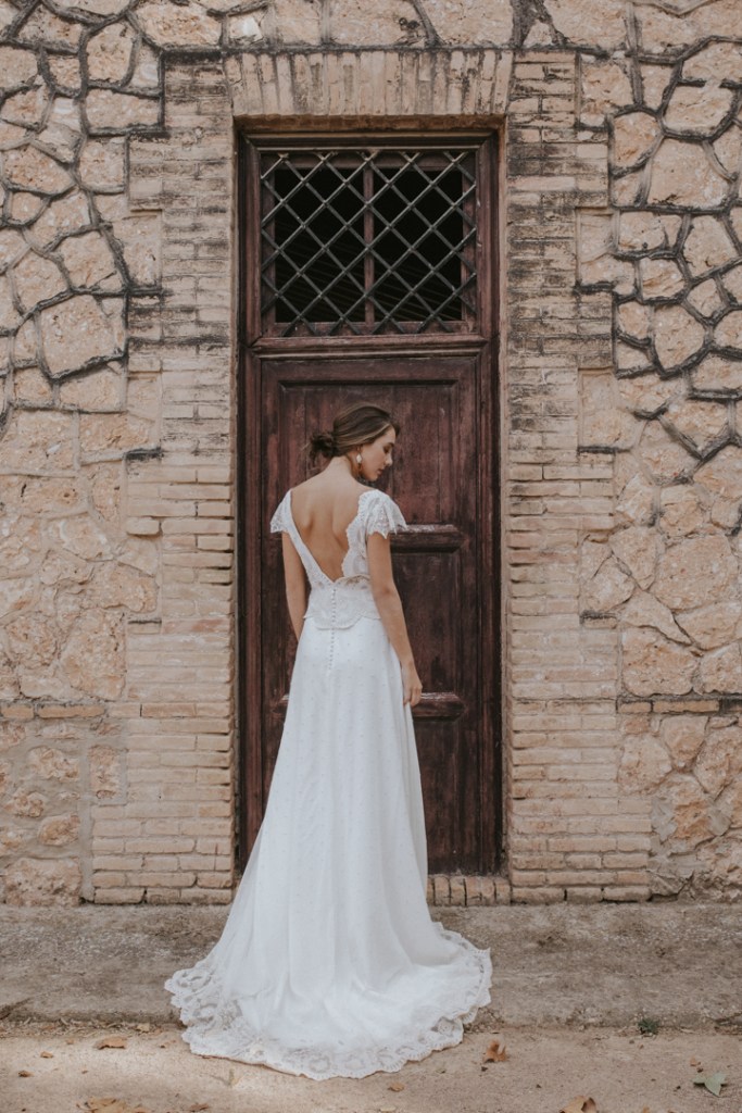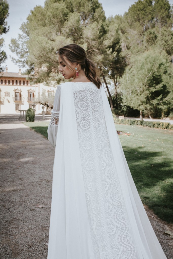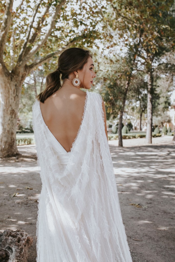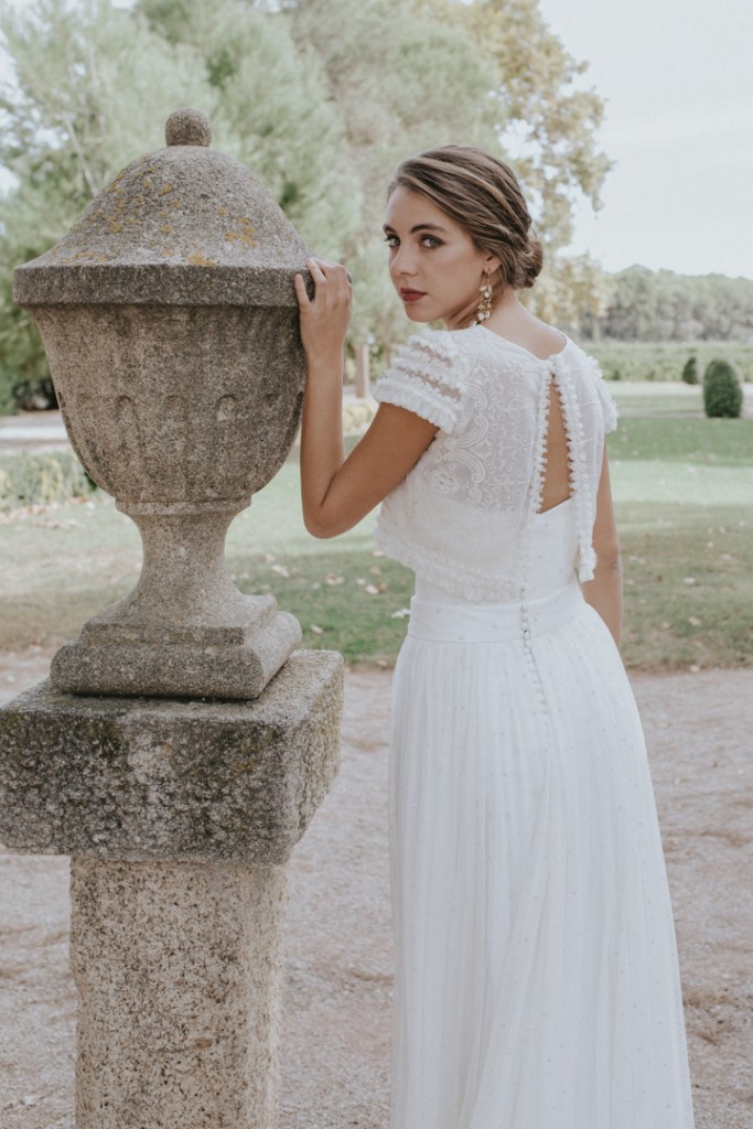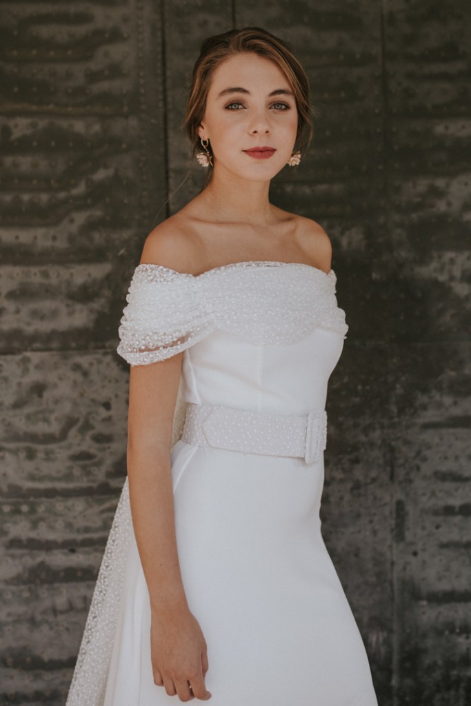 Para esta colección la diseñadora ha utilizado tejidos muy especiales, cuidadosamente seleccionados y respetando al máximo el producto y a todas las personas que han participado en su creación. Guipur, crepé, satén y bordados hechos a mano, tratados con cariño y de forma artesanal. El resultado final muestra unos diseños totalmente personalizables y versátiles que consiguen fusionar diferentes texturas y que son desmontables, permitiendo crear diferentes looks a lo largo de todo el día de la boda.