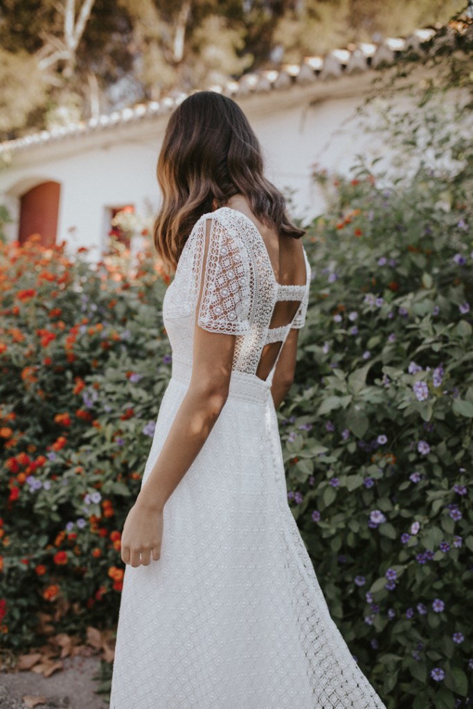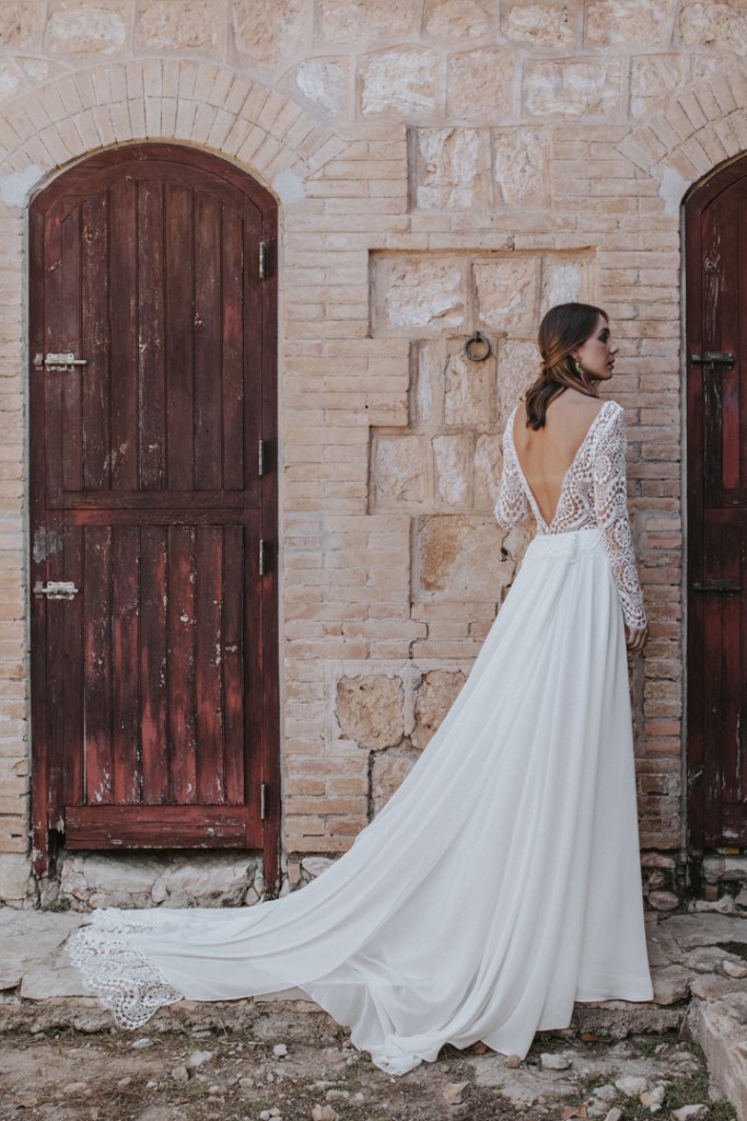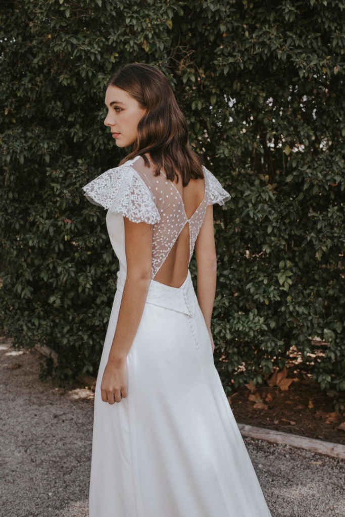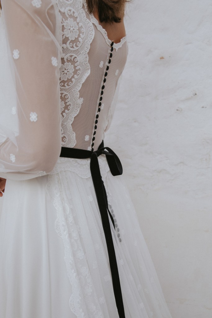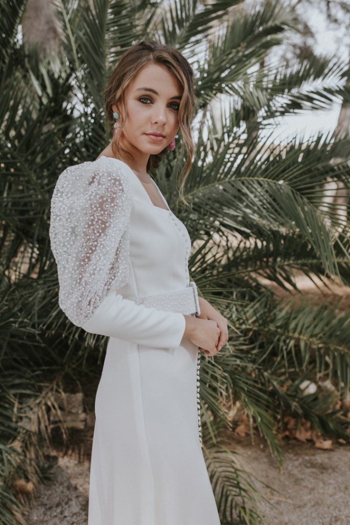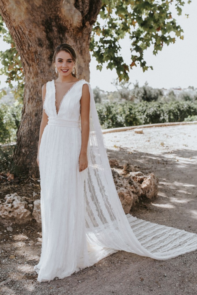 Para esta colección la diseñadora ha utilizado tejidos muy especiales, cuidadosamente seleccionados y respetando al máximo el producto y a todas las personas que han participado en su creación. Guipur, crepé, satén y bordados hechos a mano, tratados con cariño y de forma artesanal. El resultado final muestra unos diseños totalmente personalizables y versátiles que consiguen fusionar diferentes texturas y que son desmontables, permitiendo crear diferentes looks a lo largo de todo el día de la boda.