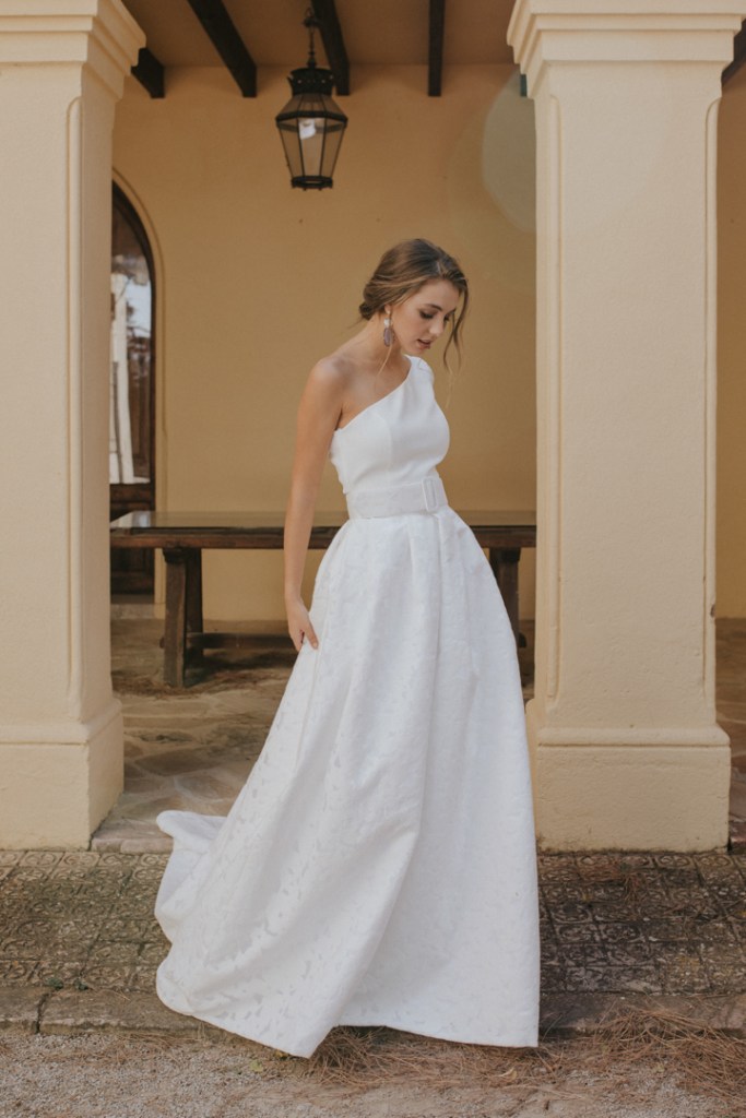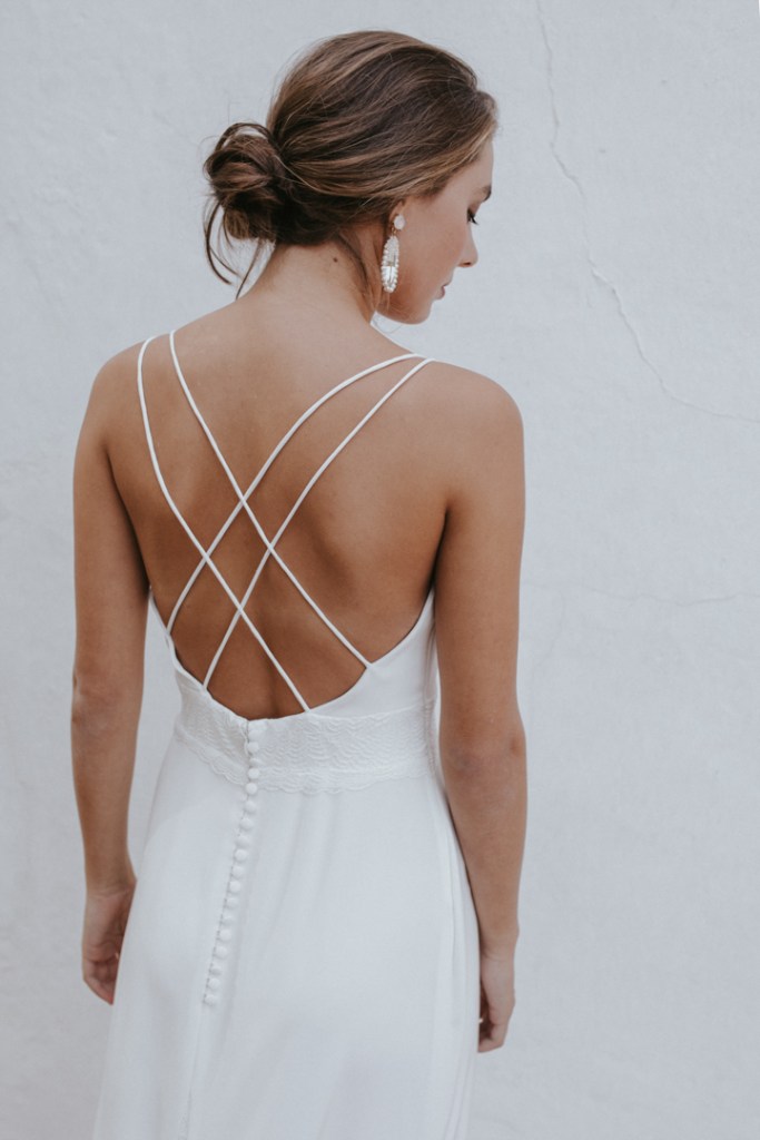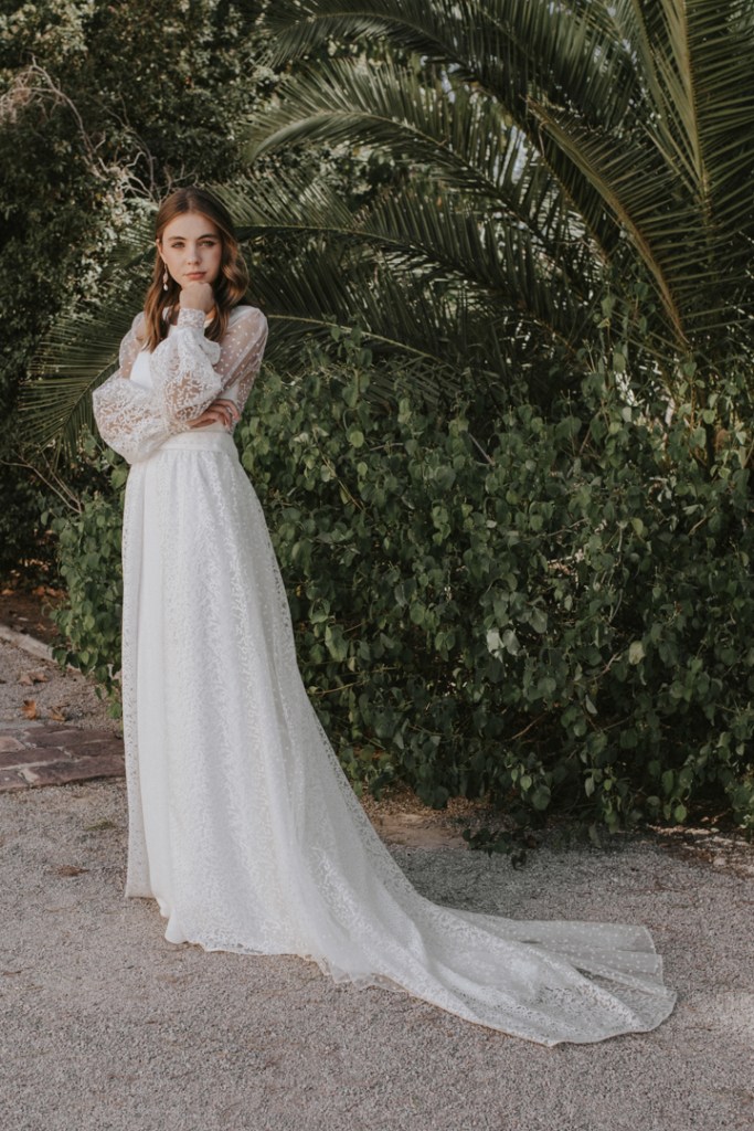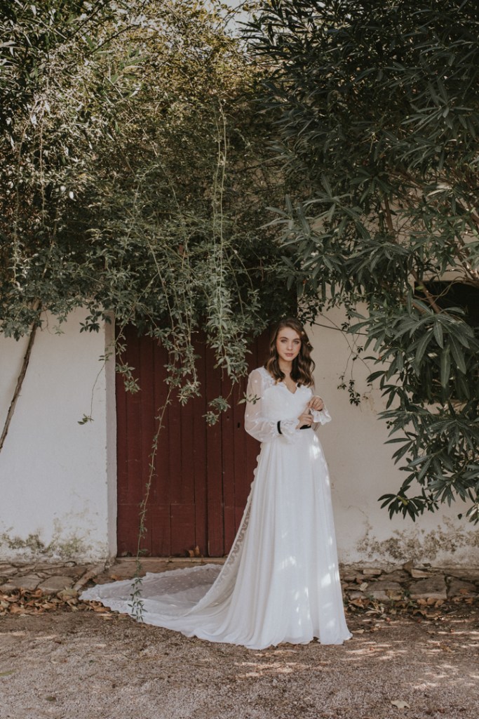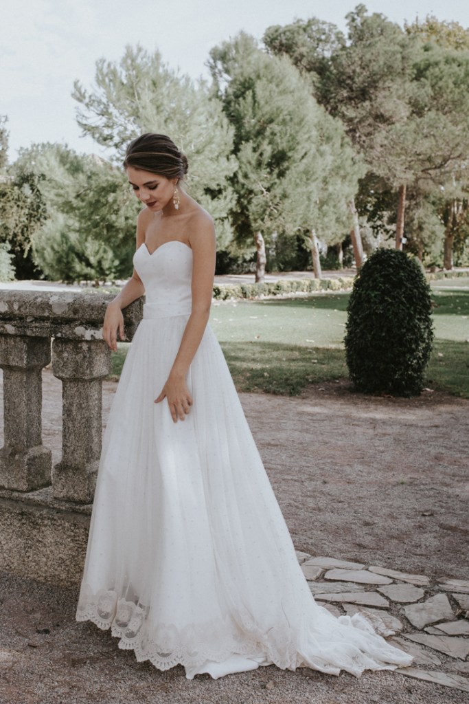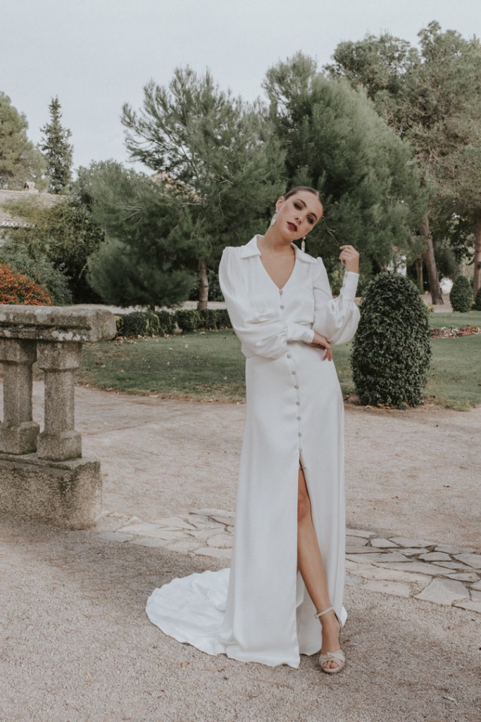 Para esta colección la diseñadora ha utilizado tejidos muy especiales, cuidadosamente seleccionados y respetando al máximo el producto y a todas las personas que han participado en su creación. Guipur, crepé, satén y bordados hechos a mano, tratados con cariño y de forma artesanal. El resultado final muestra unos diseños totalmente personalizables y versátiles que consiguen fusionar diferentes texturas y que son desmontables, permitiendo crear diferentes looks a lo largo de todo el día de la boda.