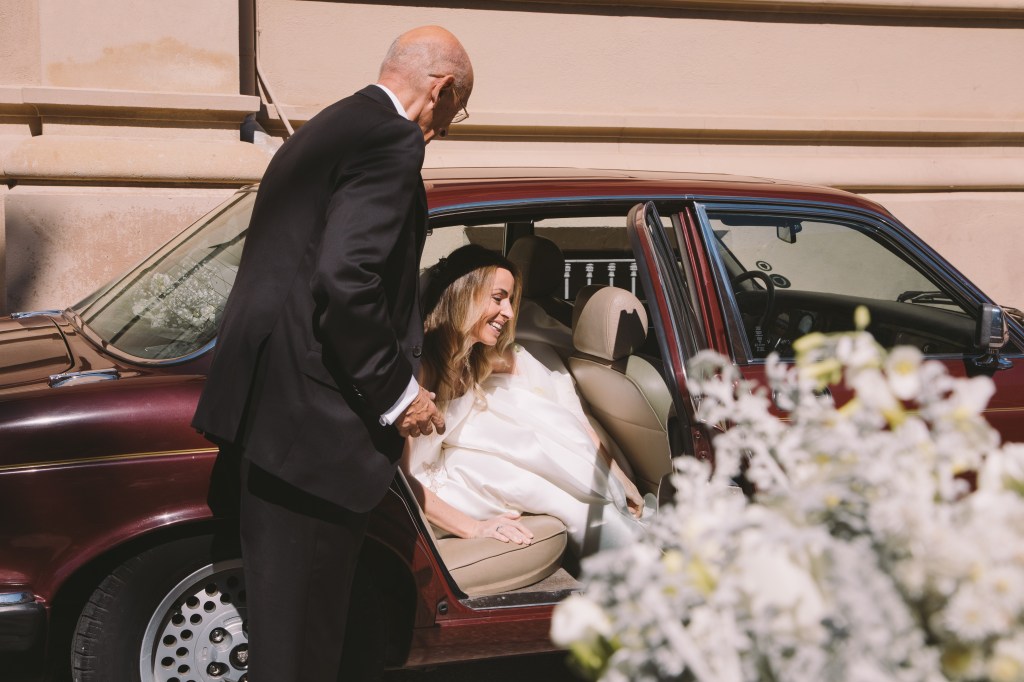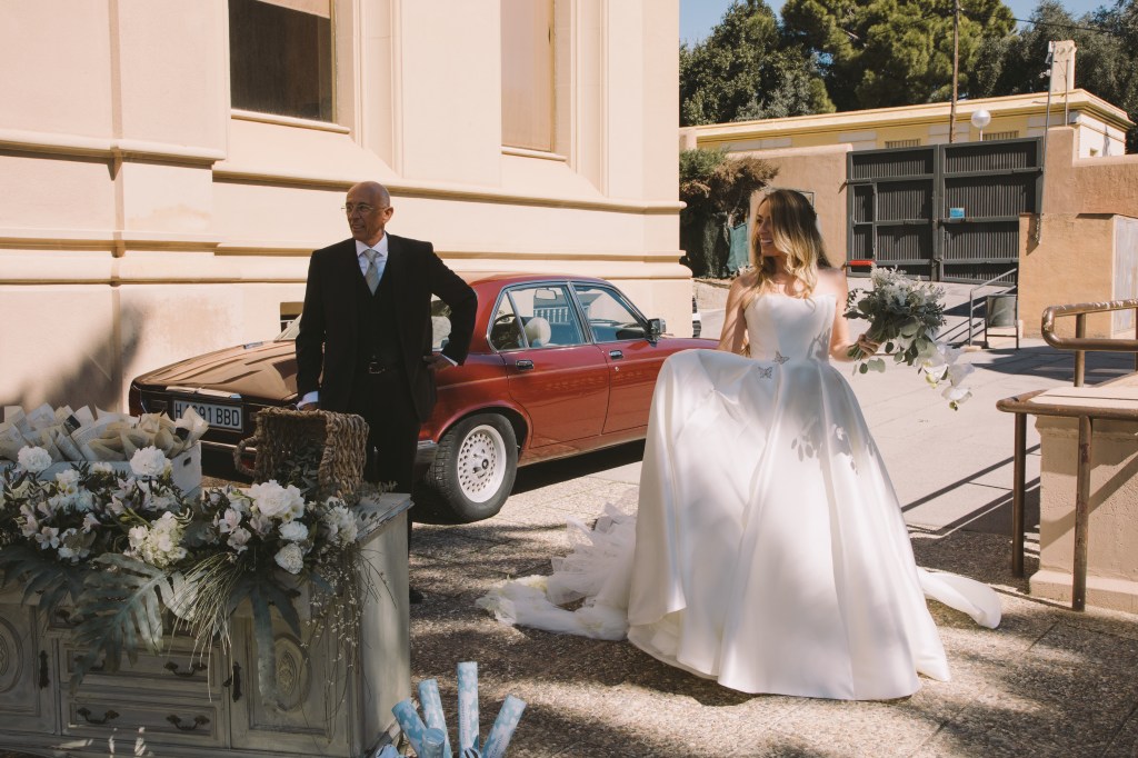 Un diseño de pronovias en mikado con una larga cola y escote en palabra de honor. Ella buscaba un vestido sencillo, clásico, atemporal y muy favorecedor. Tenía muy claro que no quería ver las fotos de la boda en unos años y pensar que su vestido estaba totalmente pasado de moda.