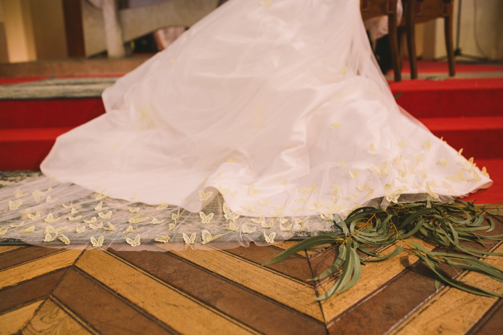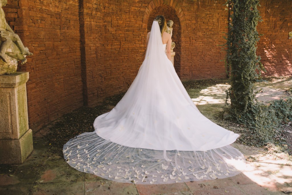 El complemento más especial para los novios sin duda fue el velo. La cola del velo estaba llena de mariposas tejidas de diferentes tamaños, la mariposa amarilla es el símbolo del realismo mágico de García Márquez, de ahí ese especial significado. Para los zapatos escogió unas espardeñas creadas artesanalmente y llenas de mariposas a juego con el velo.