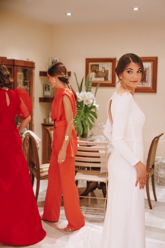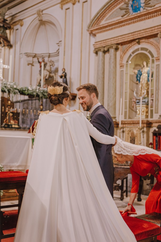 Teresa confió en Cristina Valenzuela, de Valenzuela Atelier, para diseñar su vestido de novia. Escogió unas hojas de limonero, siguiendo la temática que habían escogido para la decoración, hechas en oro en Dpiedra, una joyería artesanal muy famosa en Murcia, para decorar los hombros de su vestido y su pelo.