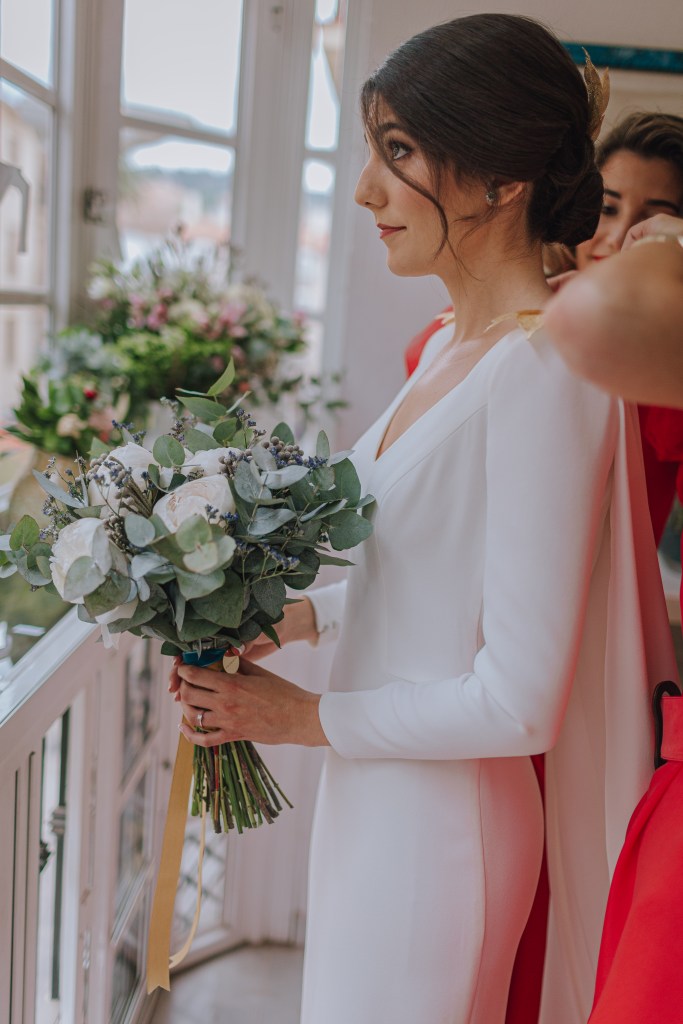 Para el ramo escogió una combinación de peonías, brunia, lavanda y eucalipto que se encargó de preparar el equipo de Atrezo Floristas, al igual que de la decoración floral de toda la finca. Acompañó su ramo con su algo “viejo y prestado”, un pañuelo que solía usar su abuelo.