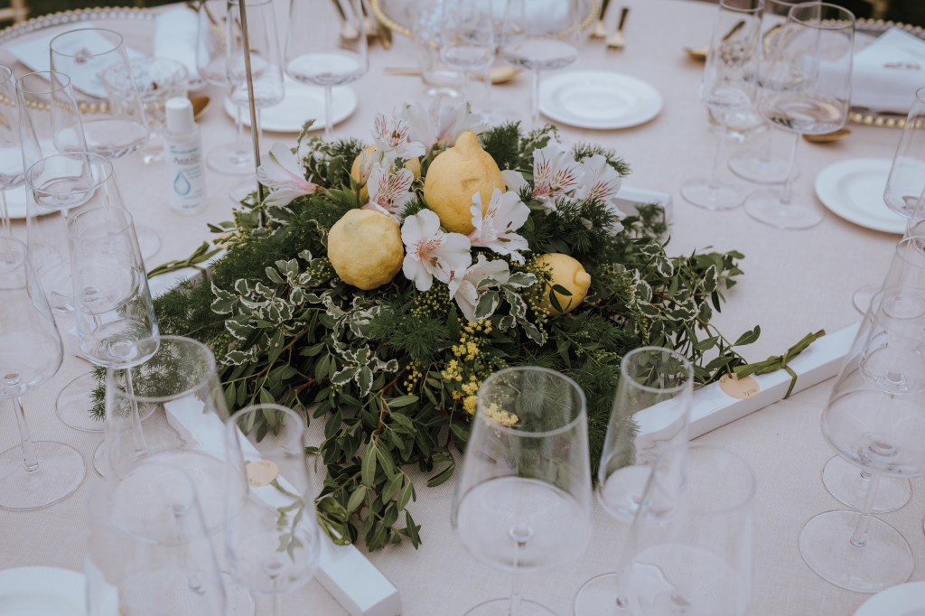 Para la decoración y temática de su boda decidieron aunar sus dos ciudades. La Granada de la familia de Teresa y Murcia, la ciudad en la que siempre han vivido y en la cual comenzó su historia. Decidieron dar guiños a sus dos ciudades y que la temática girase en torno a esto. Además, escogieron los limones como pieza fundamental en la decoración y formaron parte del ramo de novia, la decoración floral y la decoración de todas las mesas.