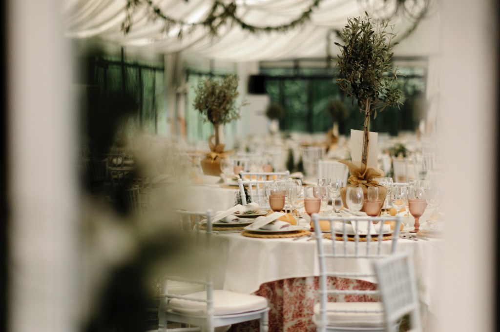 Para la celebración escogieron el Jardín las Adelfas en Villarrobledo, amor a primera vista muy cerca del pueblo de Ana. Tenían muy claro que el lugar de la celebración debía cumplir varios requisitos. Entre ellos que fuese un sitio en la naturaleza, al aire libre pero que tuviese zonas cubiertas y que además transmitiese lo que para ellos era la esencia de la boda, la alegría de celebrar con los suyos. Para la decoración escogieron luces y guirnaldas de olivo, eucalipto y falsa pimienta para decorar el techo de la carpa. Pequeños olivos fueron los elegidos para ser los protagonistas de los centros de mesa. De la decoración floral se encargó el equipo de Floristería Eva.