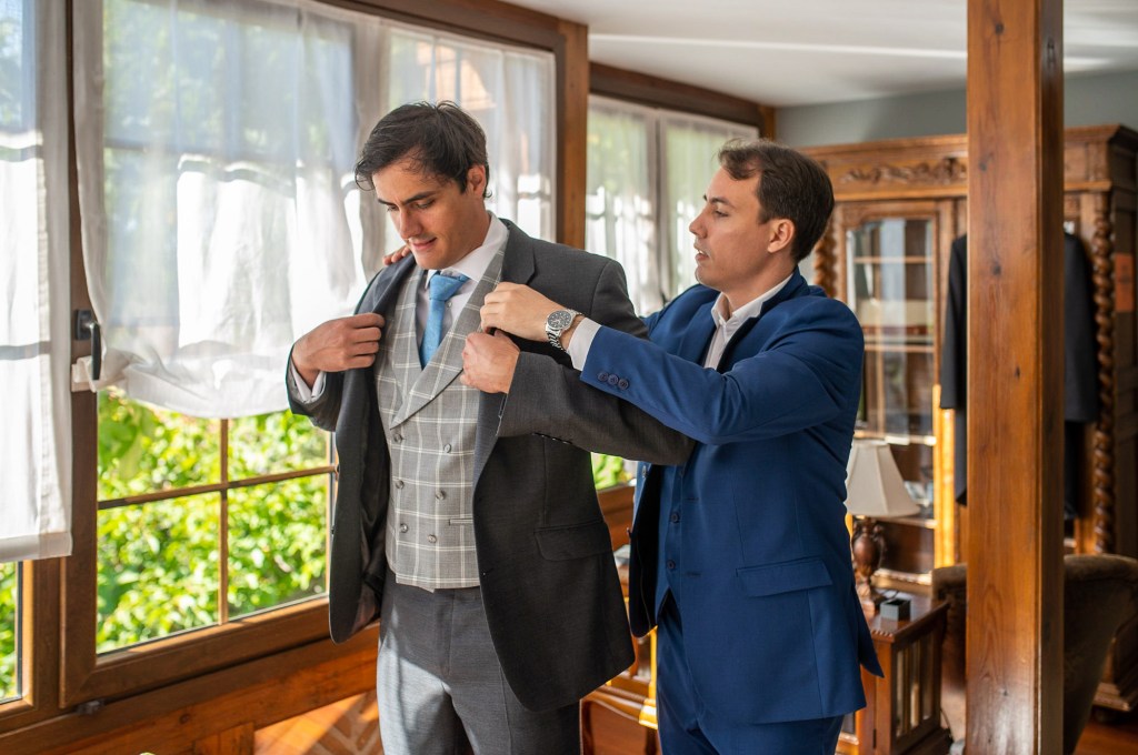 Trajes Guzmán fue la firma escogida por Dani para su traje de novio. Para completar el look escogió corbata y gemelos de la firma Carlo Visconti y zapatos de la firma Moreschi.