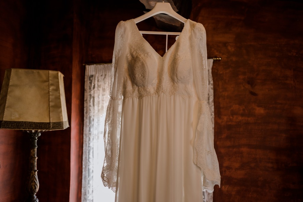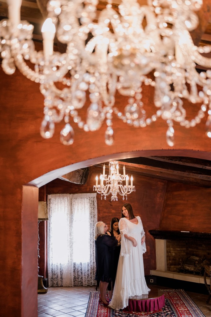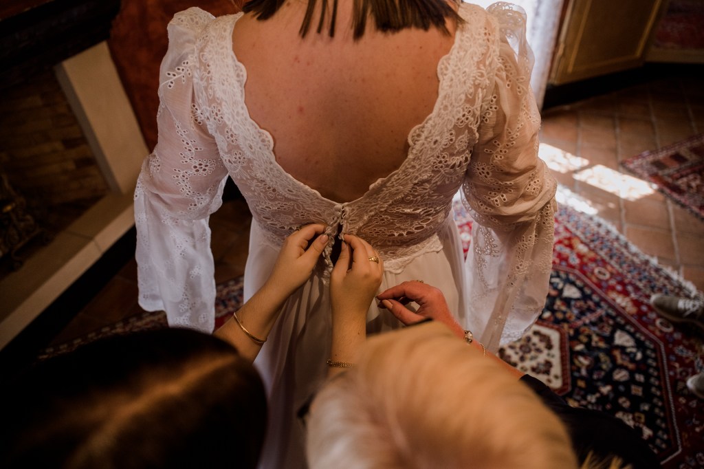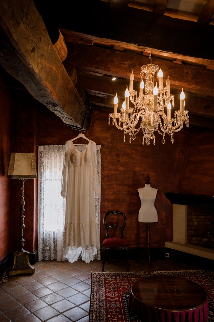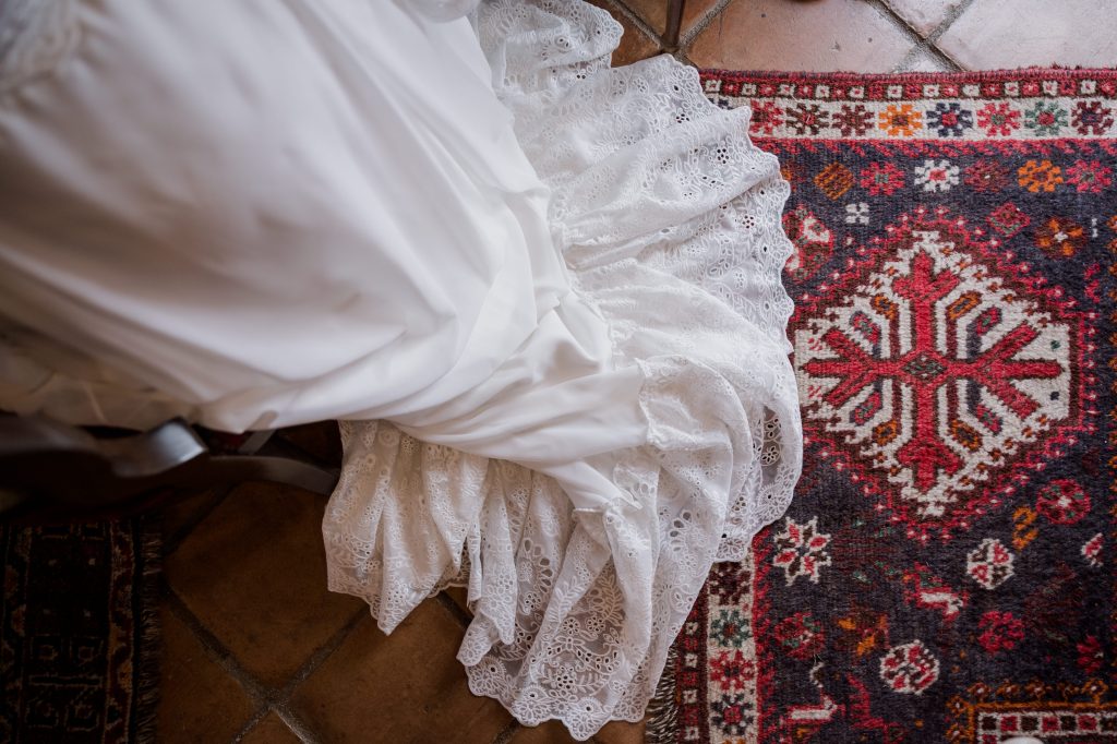 La confección de su vestido tiene historia. Lorena siempre había tenido en mente un diseño bastante sencillo y cómodo confeccionado en el tejido de sus sueños. En 2018 en el Atelier escogieron una tela para uno de los vestidos de su colección Mediterranean Nature. Fue amor a primera vista y Lorena les pidió en varias ocasiones (y mucho antes de saber que se casaría) que guardasen algunos metros para ella, por si acaso no podían volver a encontrarlo. Una bambula sedosa y bordada con detalles calados que convirtieron en el vestido de sus sueños confeccionando unas mangas abullonadas que finalizaban en campana en concordancia con el volante de la falda del vestido. Para darle un toque mas cañero y divertido añadieron una profunda abertura lateral a la falda.