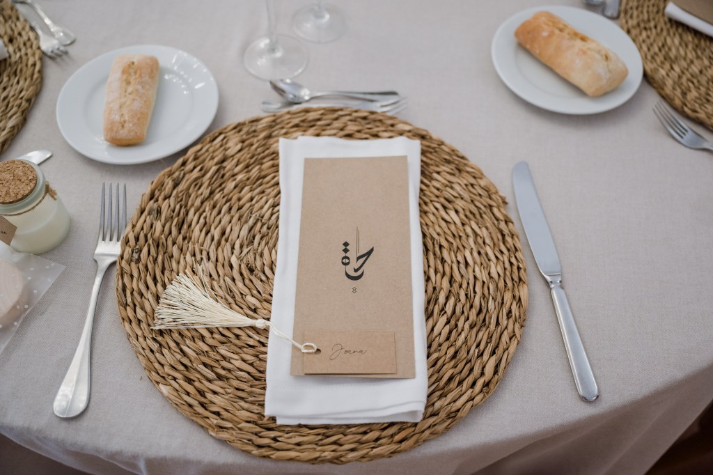 Para la temática de su boda decidieron hacer guiños a Marraquech, su ciudad. El logo de su boda significa en beréber “Vida”, un símbolo muy especial para ellos. Lorena y su hermana, diseñadora gráfica, se encargaron de personalizar todos los detallitos de papelería de la boda, además se encargaron de preparar y decorar el sitting plan. Además ellas mismas se encargaron de personalizar los regalitos de los invitados.