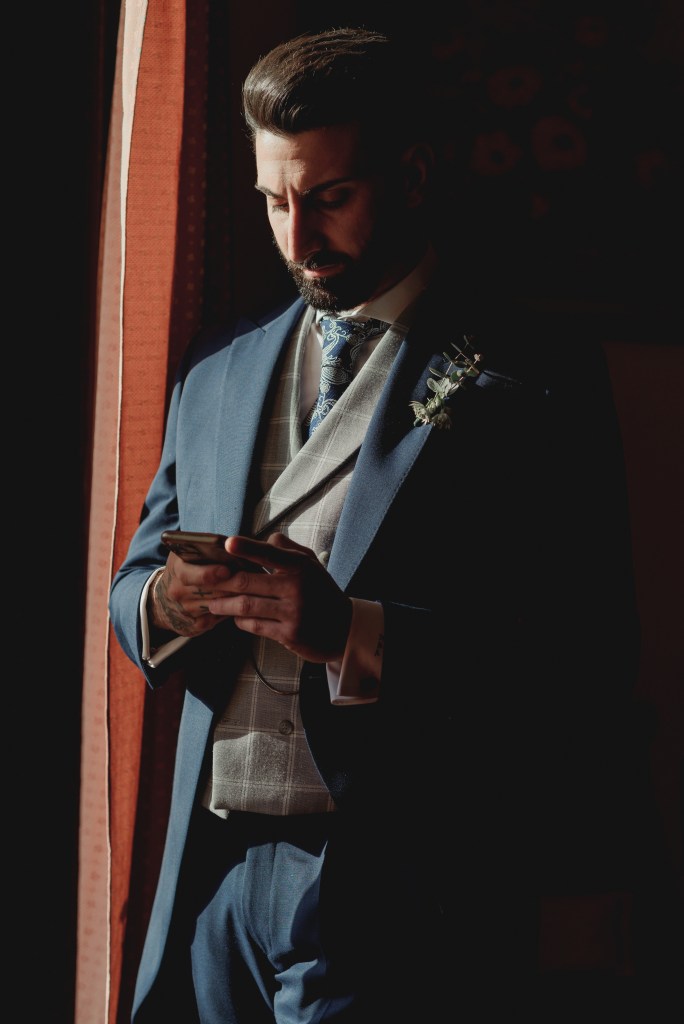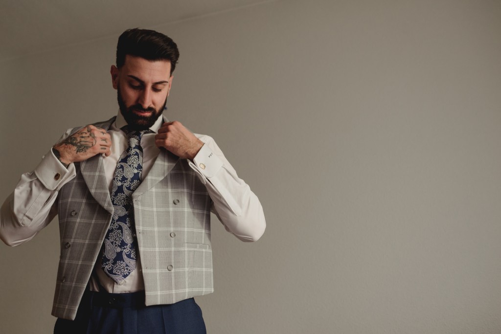 Fabio escogió un chaqué de corte clásico en color azul tinta de la firma Trajes Guzmán. Para darle un punto de contraste se decantó por un chaleco de cuadros en tonos grises y azules que combinó con una corbata de aire más moderno. Para completar el look llevó tirantes de la firma scalpers y una camisa blanca de algodón egipcio bordada con sus iniciales.