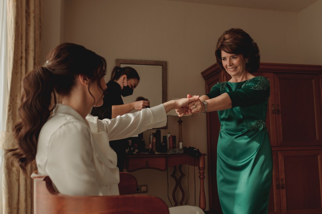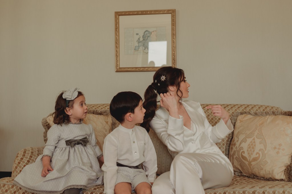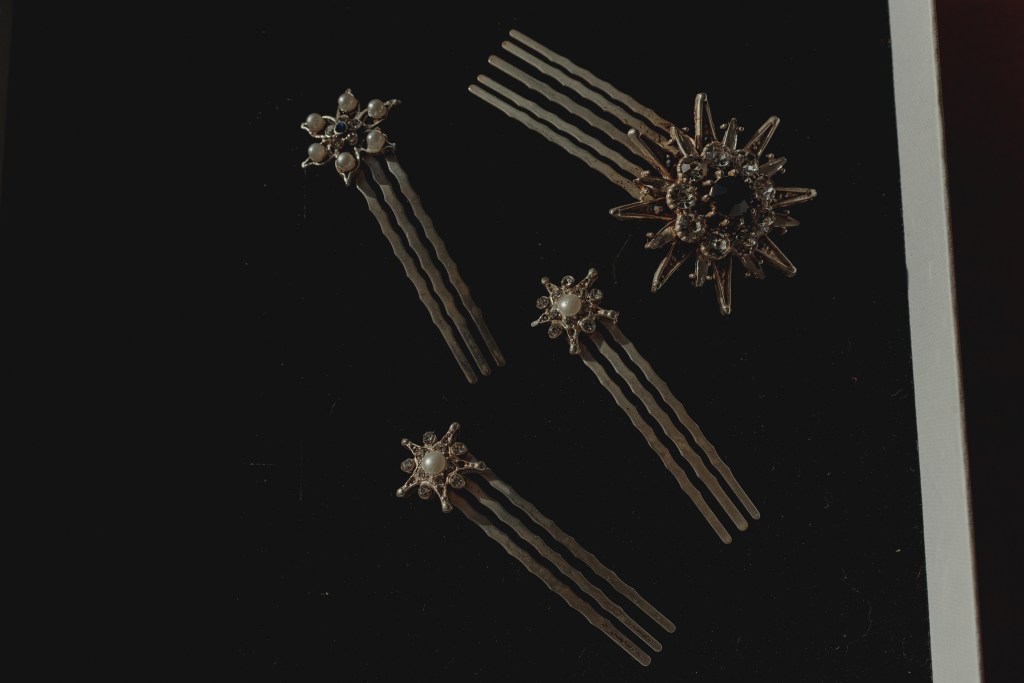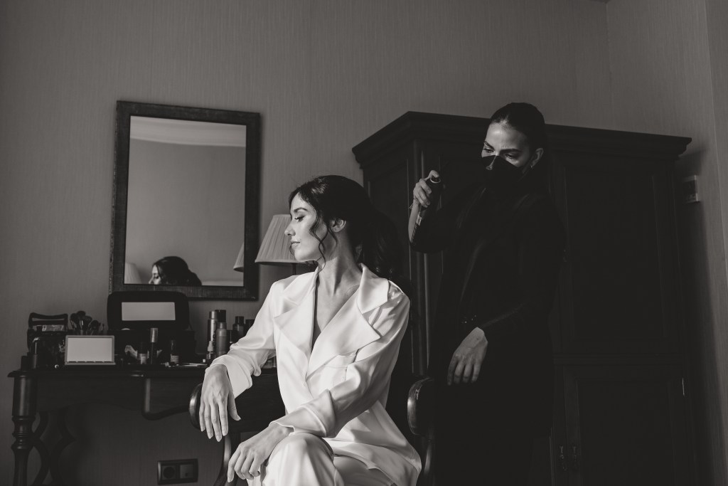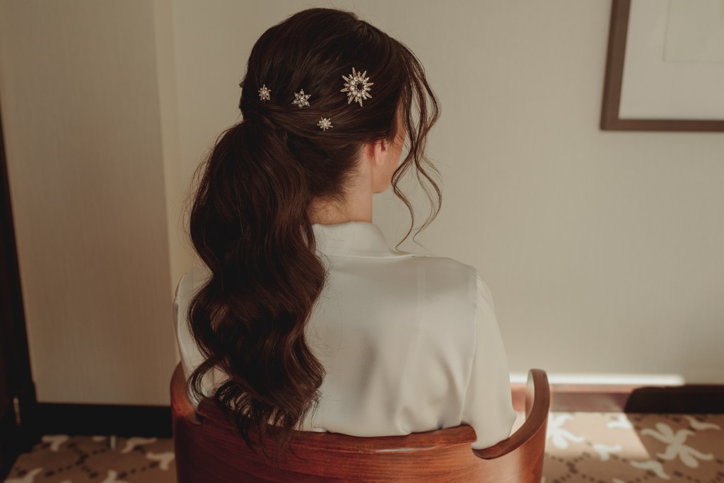 Para el peinado se decidió por una coleta a media altura con ondas al agua, Verónica Cifuentes fue la encargada del peinado y maquillaje de la novia. Una peinas en forma de estrella de M de Paulet fueron el toque perfecto para cerrar todo el look. Las peinas llevan un toque azul muy sutil que hacía un guiño a su anillo de pedida de la firma Mumit compuesto por un precioso zafiro y que lució como único complemento en las manos.