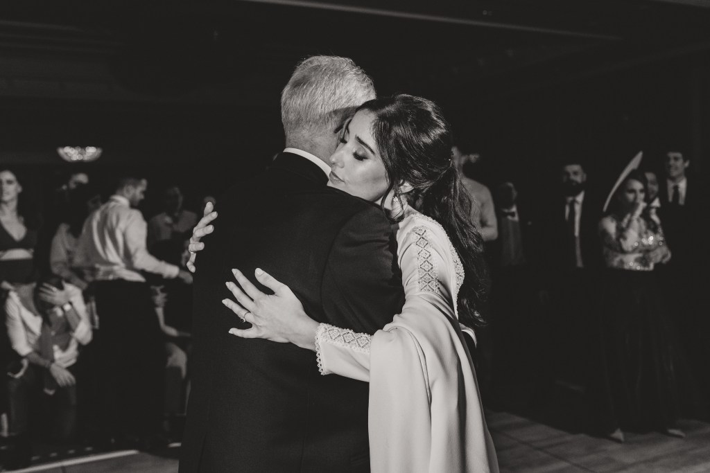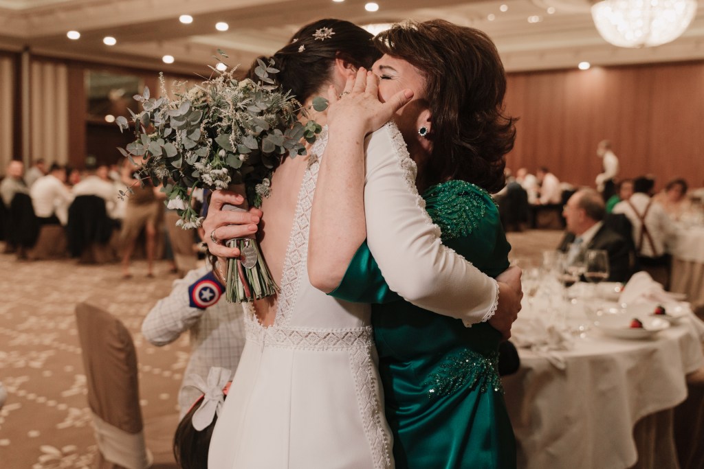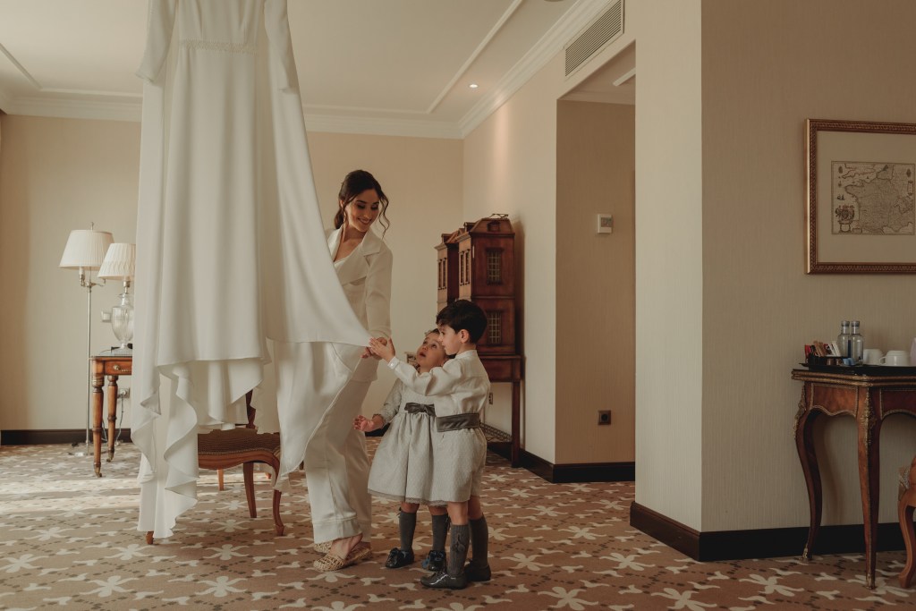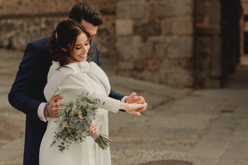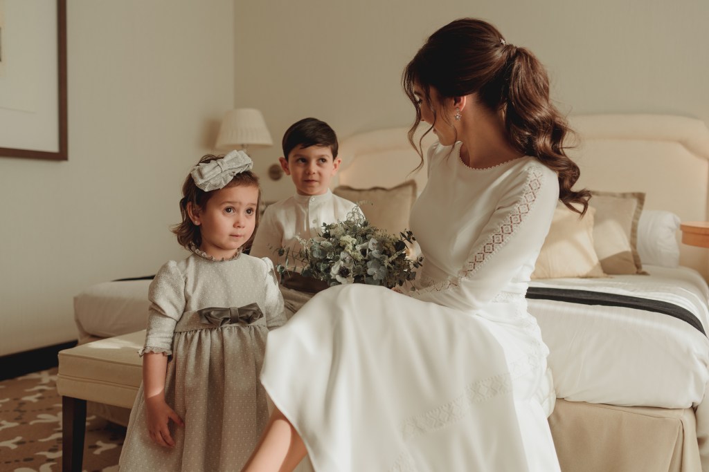 Para su primer diseño tenía muy claras dos premisas que debía cumplir su vestido de novia: que fuese sencillo, pero que además tuviese un toque invernal acorde a la fecha de la boda. Finalmente se decantó por el modelo Talía de la firma de novias Rosa Clará, un diseño con un aire muy bohemio, manga larga acompañado de un escote barco y una espalda abierta aportando esa sensualidad elegante que enamoró a Gemma.