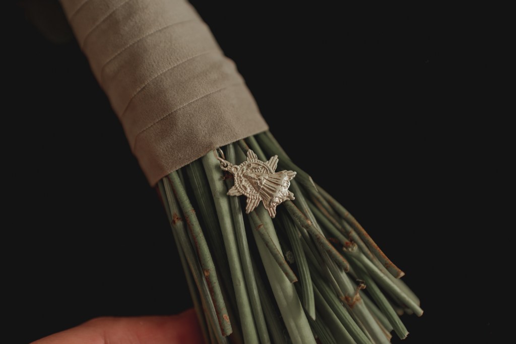 Para el ramo Gemma decidió optar por tonos verdes y anemonas. Para darle un toque de color escogió algunas flores amarillas, color que identifica su personalidad. Junto al ramo llevaba dos medallas muy especiales, Nuestra Señora de La Estrella de Toledo regalo de su madre y una medalla muy simbólica y especial con las iniciales de todas sus amigas y una frase muy especial.