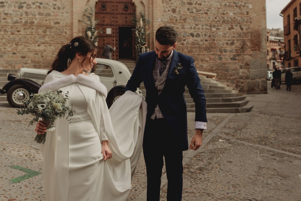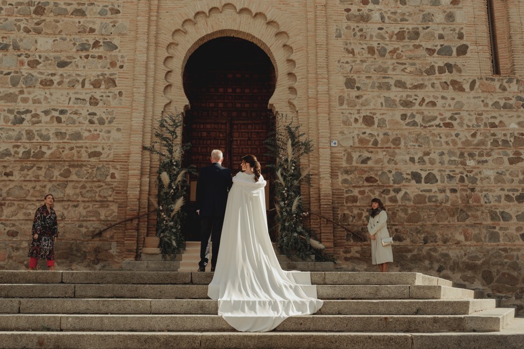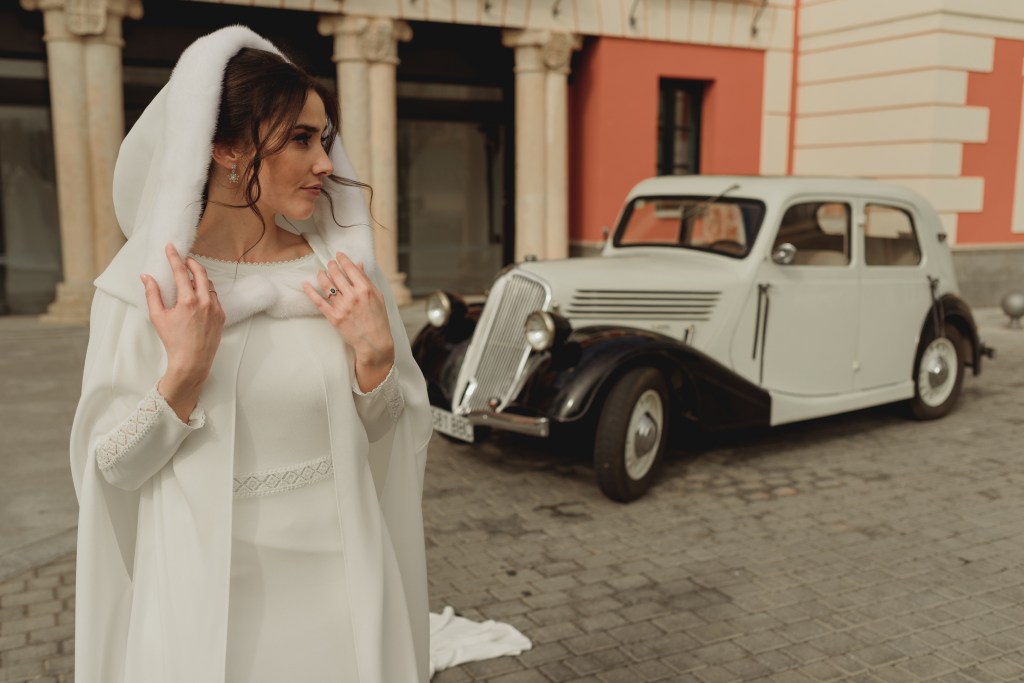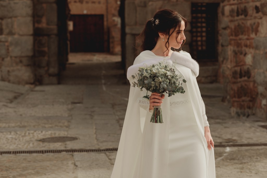 Como complementos a su primer look de novia escogió una capa confeccionada en el mismo crepé del vestido con una gran caída que complementó con unos detalles de visón en la capucha confeccionados por Fernando Gómez, un maestro artesano.