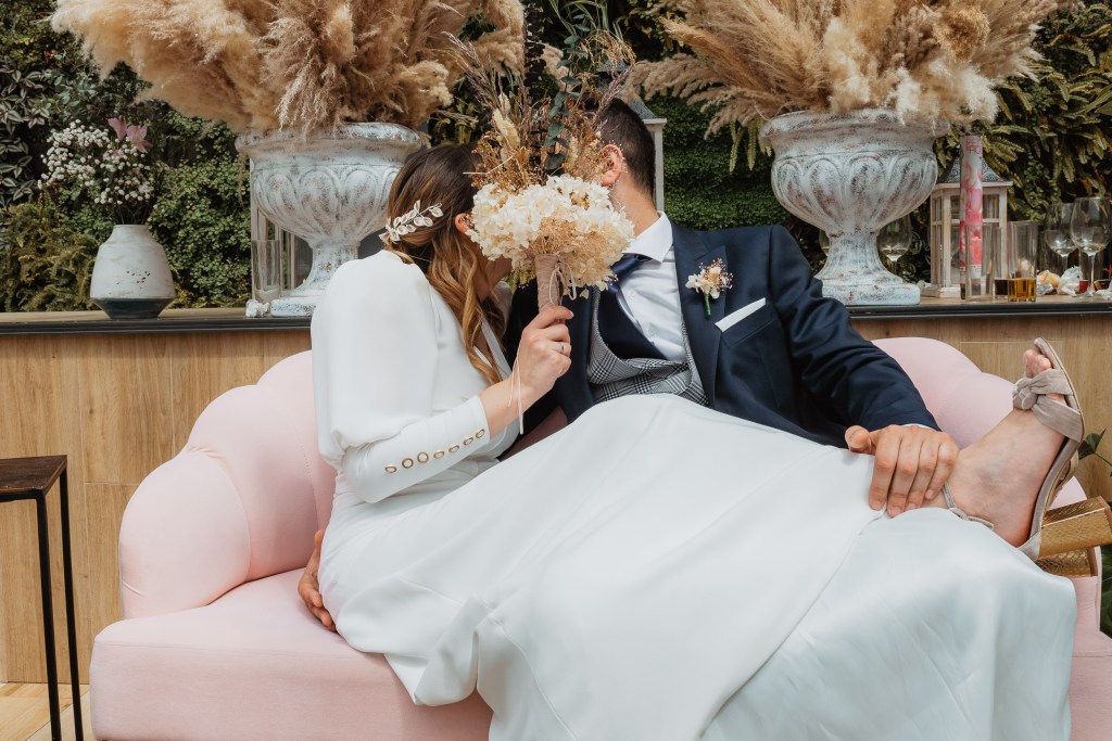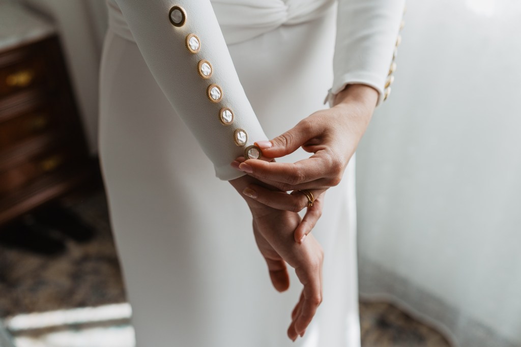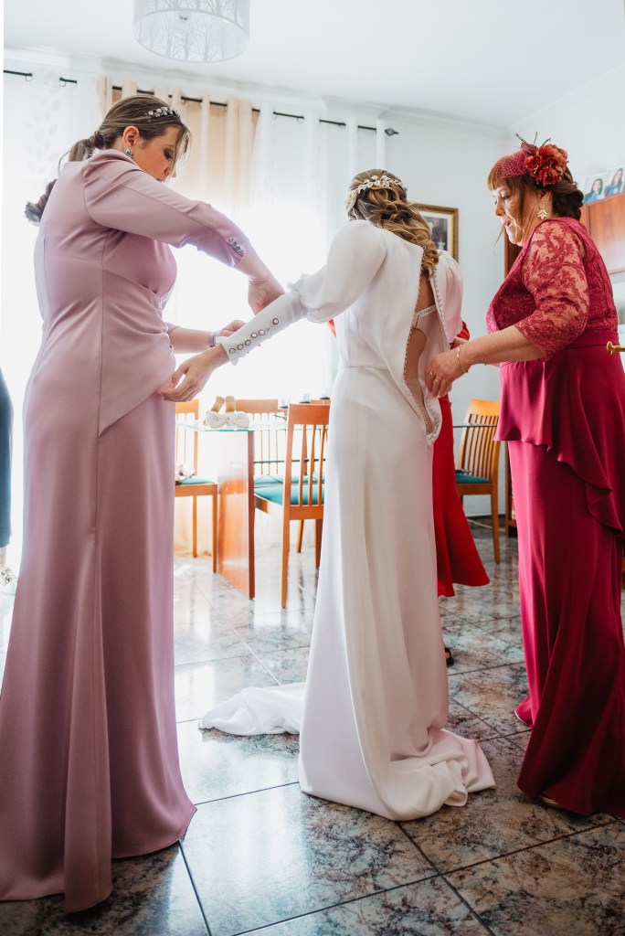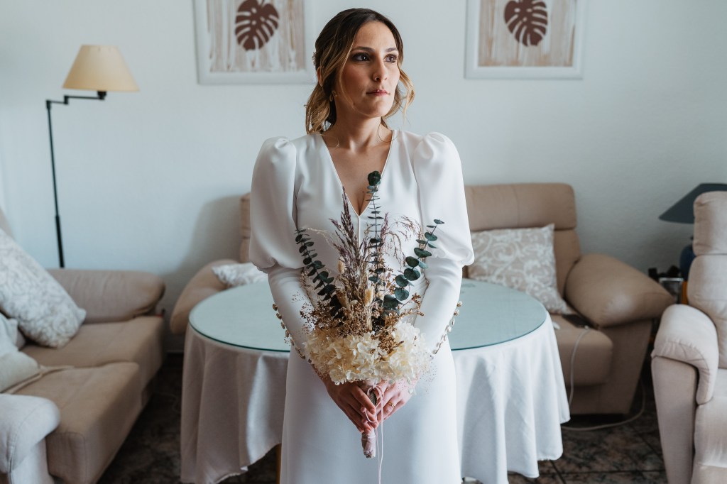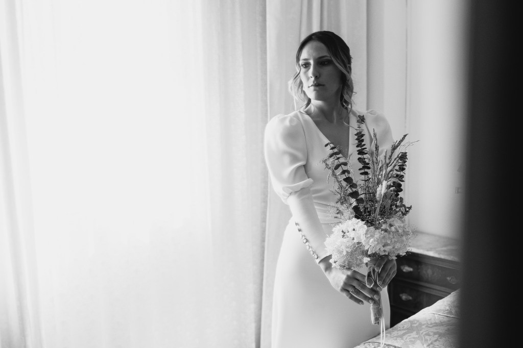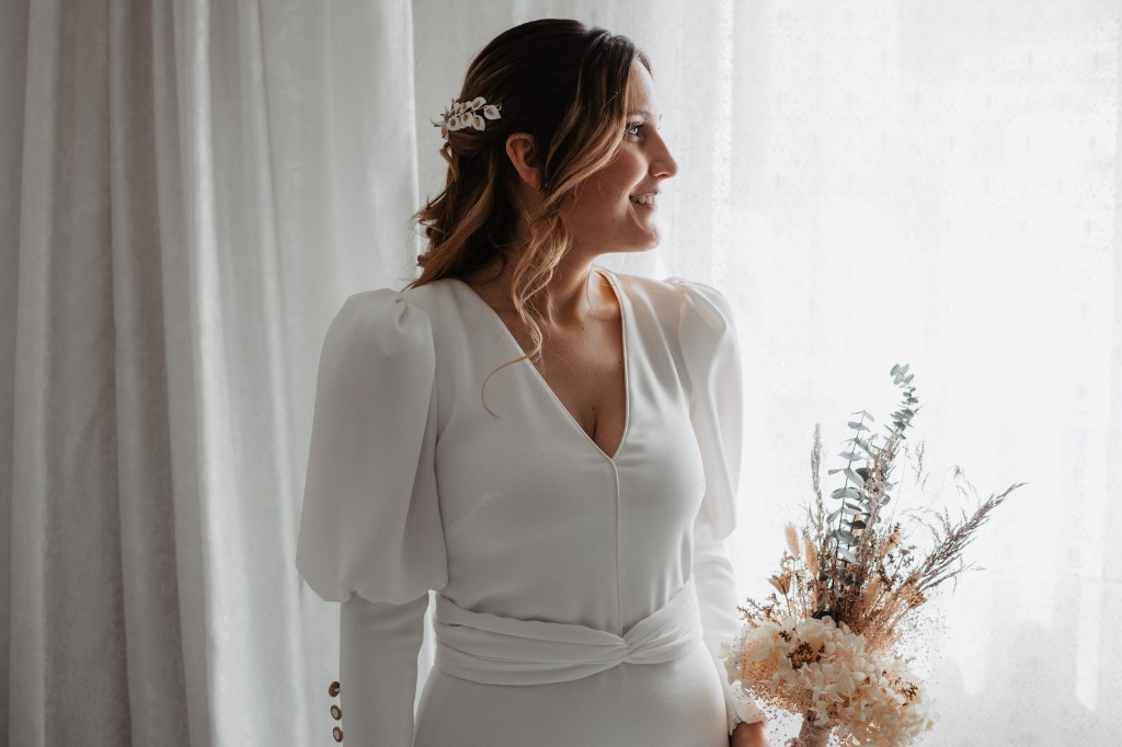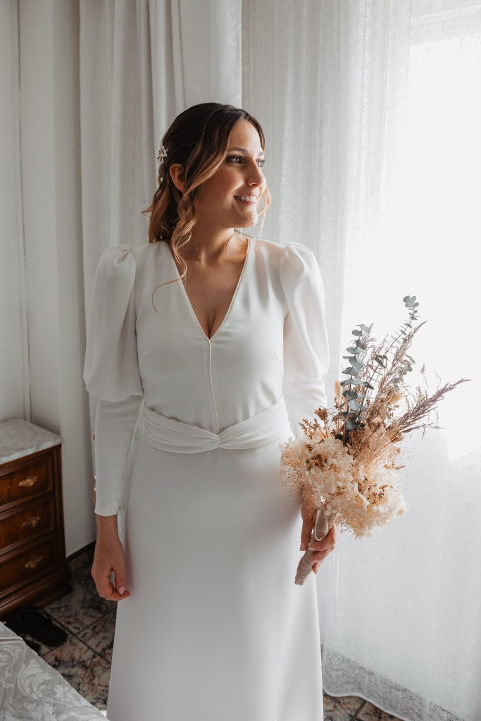 El vestido, me cuenta Marta, fue todo un flechazo. Fue uno de las primeras opciones que decidió probarse y lo tuvo bastante claro desde ese momento. Sus preciosas mangas abotonadas fueron el detalle que la enamoró. Consiguió su vestido, de la firma Panambi Novias, en Atelier de Essencias una tienda multimarca de novias.