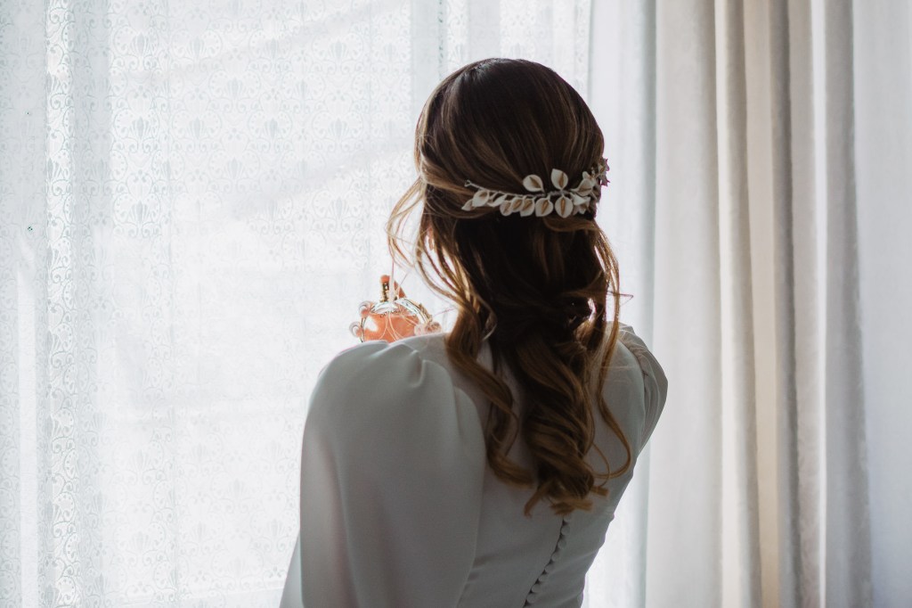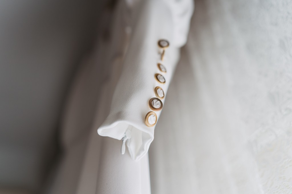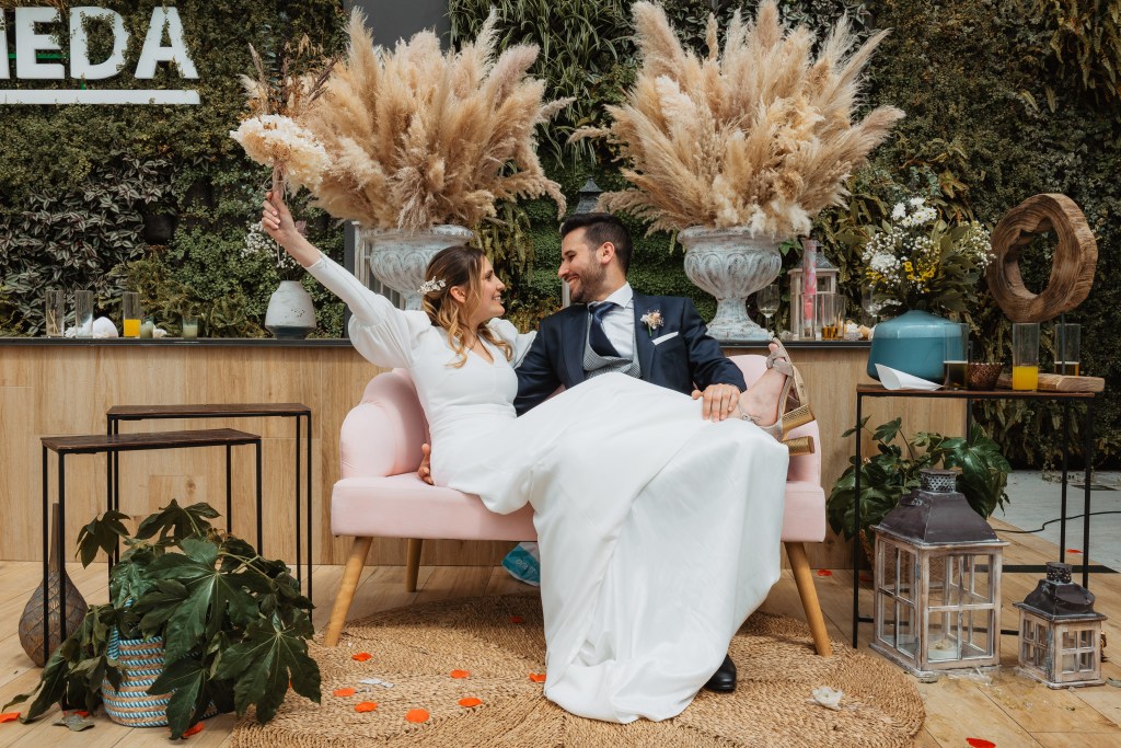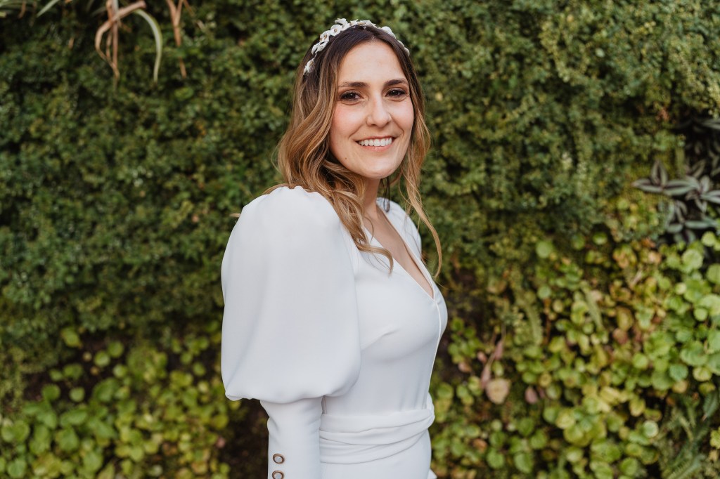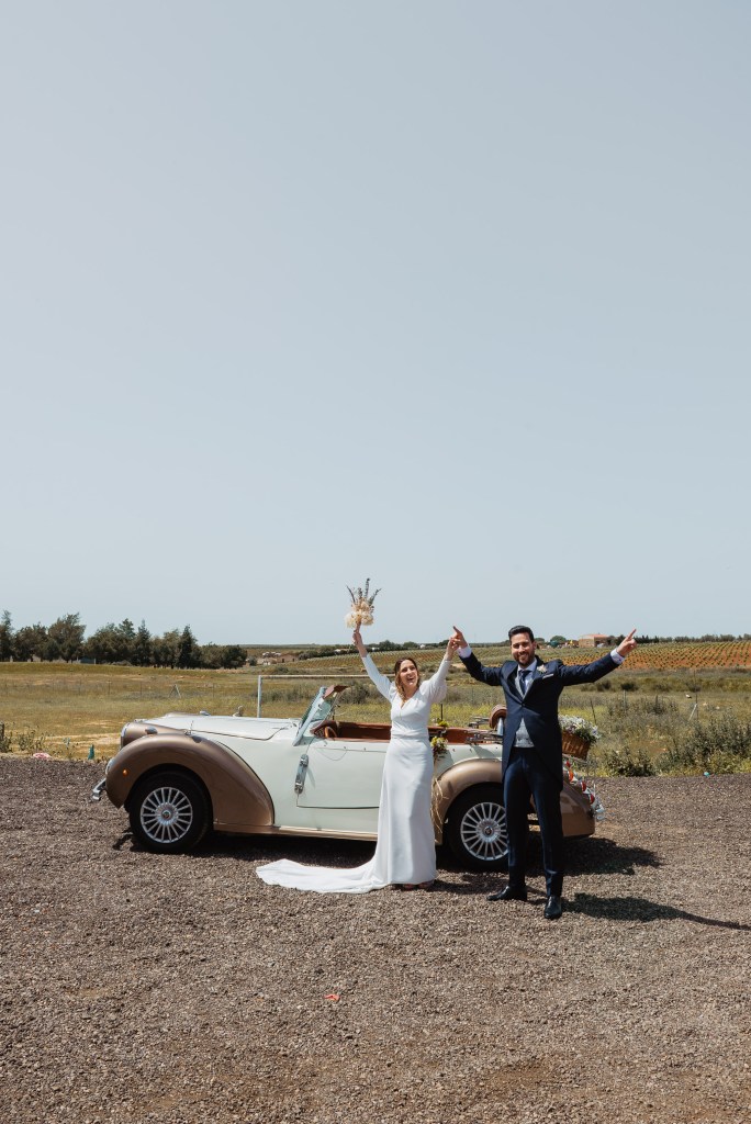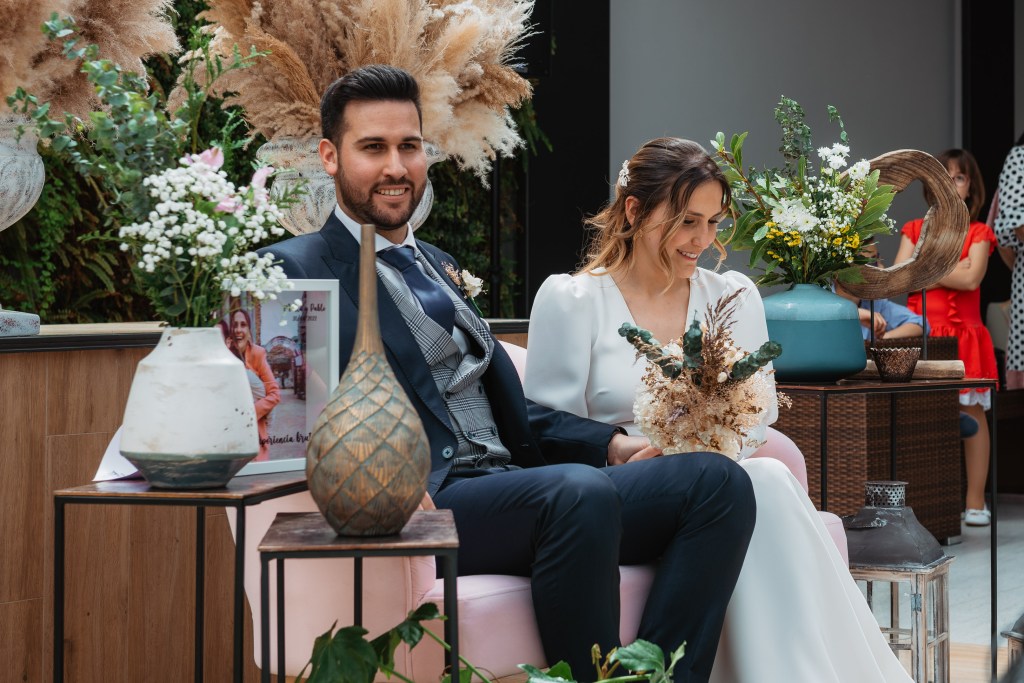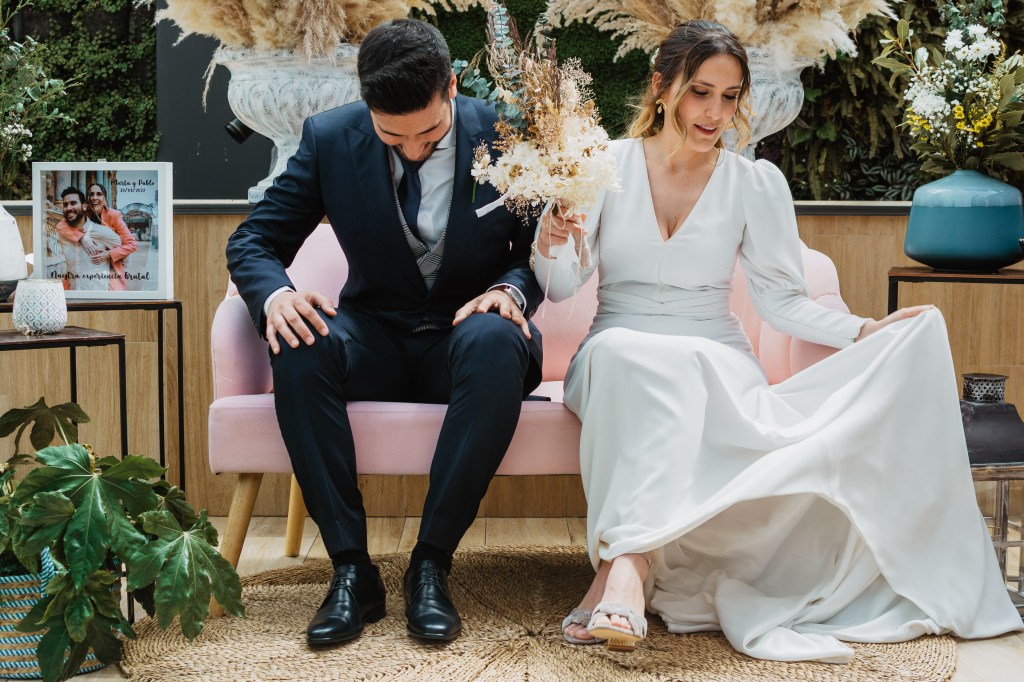El vestido, me cuenta Marta, fue todo un flechazo. Fue uno de las primeras opciones que decidió probarse y lo tuvo bastante claro desde ese momento. Sus preciosas mangas abotonadas fueron el detalle que la enamoró. Consiguió su vestido, de la firma Panambi Novias, en Atelier de Essencias una tienda multimarca de novias.