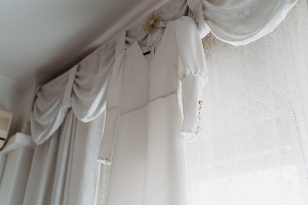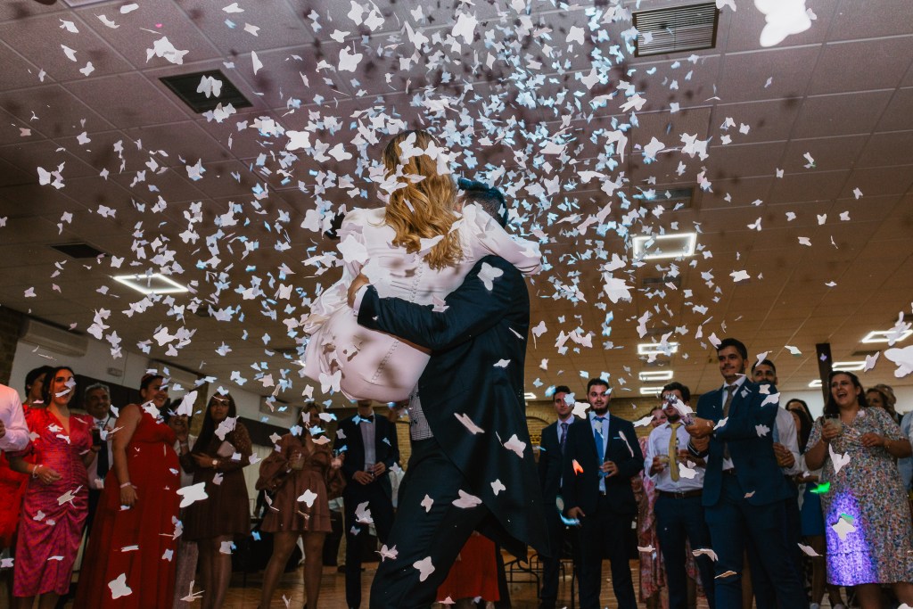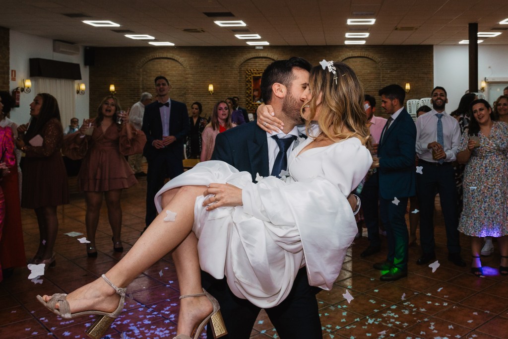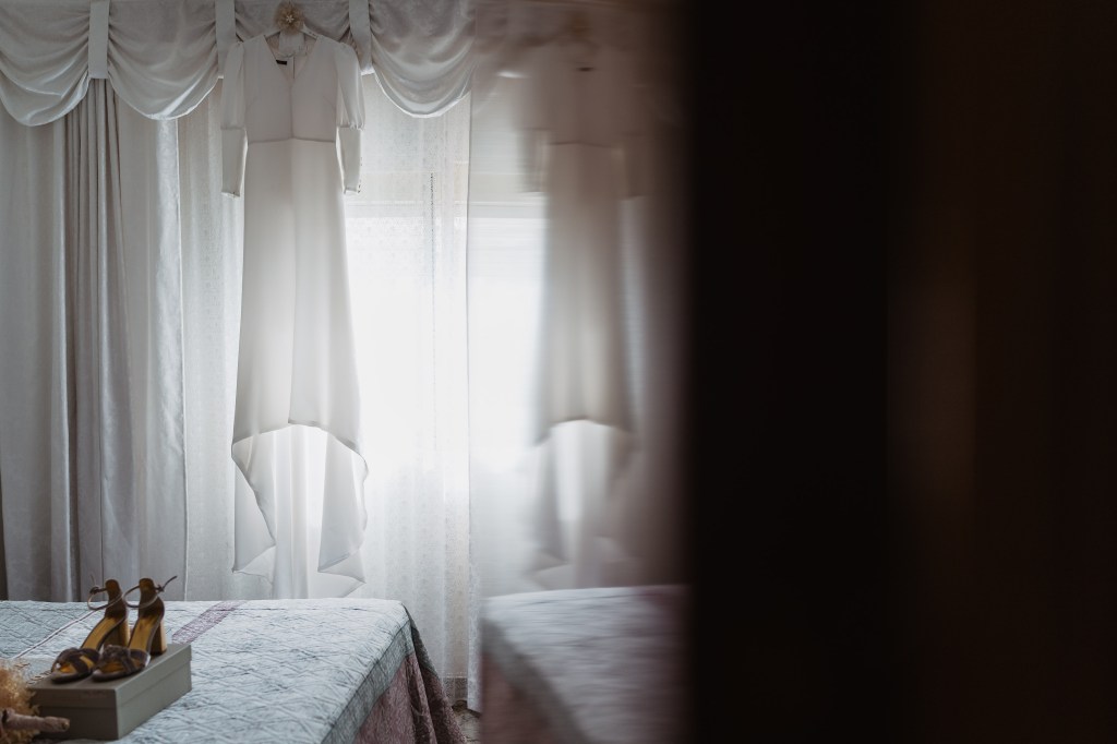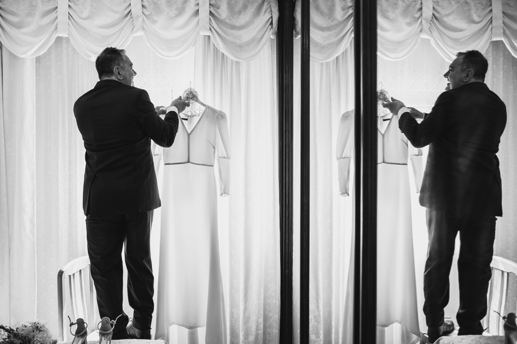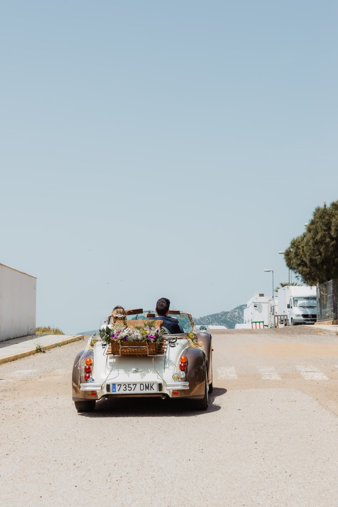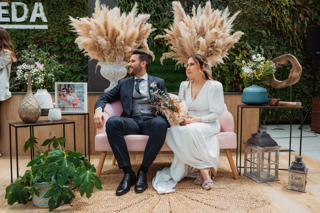El vestido, me cuenta Marta, fue todo un flechazo. Fue uno de las primeras opciones que decidió probarse y lo tuvo bastante claro desde ese momento. Sus preciosas mangas abotonadas fueron el detalle que la enamoró. Consiguió su vestido, de la firma Panambi Novias, en Atelier de Essencias una tienda multimarca de novias.